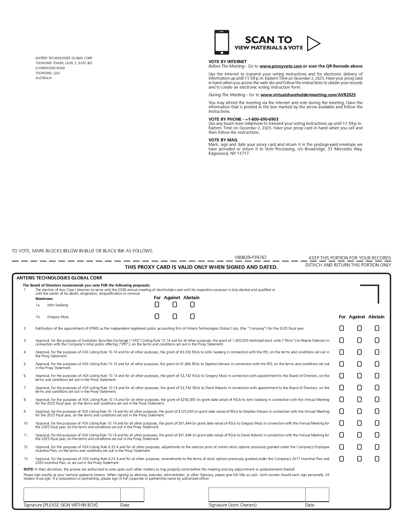 • | “FOR” the approval, for the purposes of ASX Listing Rule 10.14 and for all other purposes, the grant of $250,000 (in grant date value) of RSUs to John Seaberg in connection with the Annual Meeting for the 2025 fiscal year, on the terms and conditions set out in this Proxy Statement; |