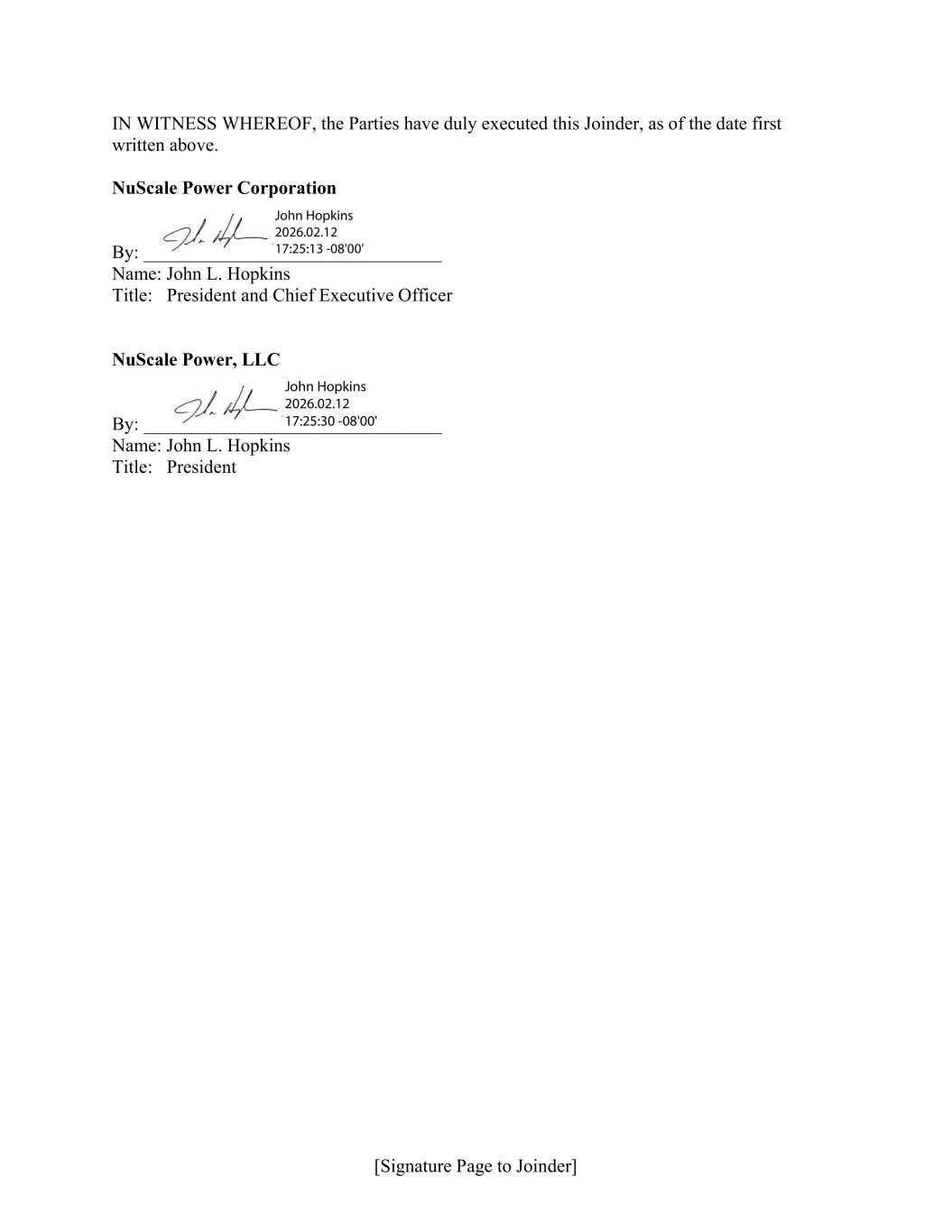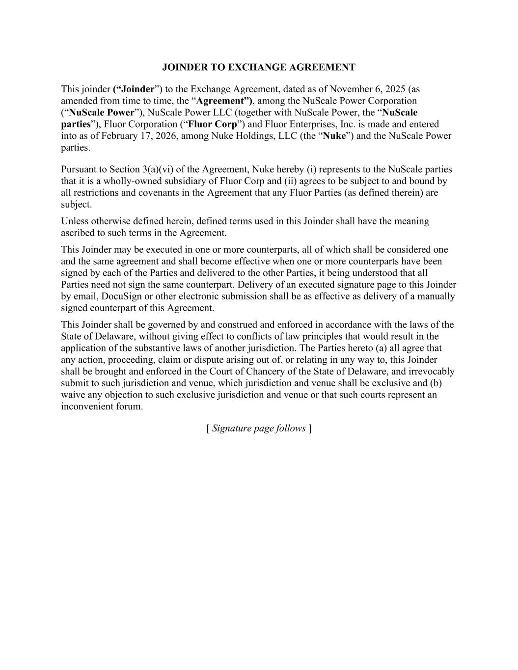 The Company agreed not to sell any of the newly authorized shares prior to March 1, 2026, except for up to 20 million newly authorized shares that may be sold in any transaction other than certain underwritten, registered offerings or PIPE transactions. In connection with the Exchange Agreement, NuScale and Fluor agreed to certain mutual releases related to the Exclusivity Agreement, Fluor’s exclusivity rights on NuScale projects, NuScale’s relationship with ENTRA1, and any limitations placed on Fluor’s ability to exchange shares. NuScale also agreed to indemnify Fluor with respect to certain claims by certain third-parties.