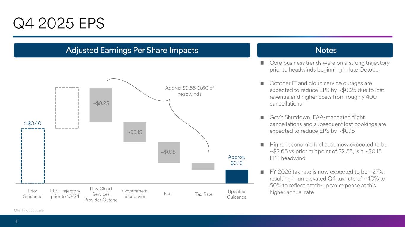 Alaska Air Group now expects ~$0.10 in adjusted earnings per share for Q4 2025 compared to the original guide of at least $0.40 per share. Several transitory headwinds totaling approximately $0.55-0.60 per share impacted the quarter, including: an internal IT and cloud service provider outage ($0.25), lost revenue due to the government shutdown ($0.15), higher fuel costs ($0.15) and a higher book tax rate for the quarter.