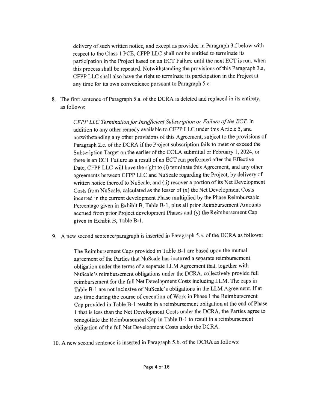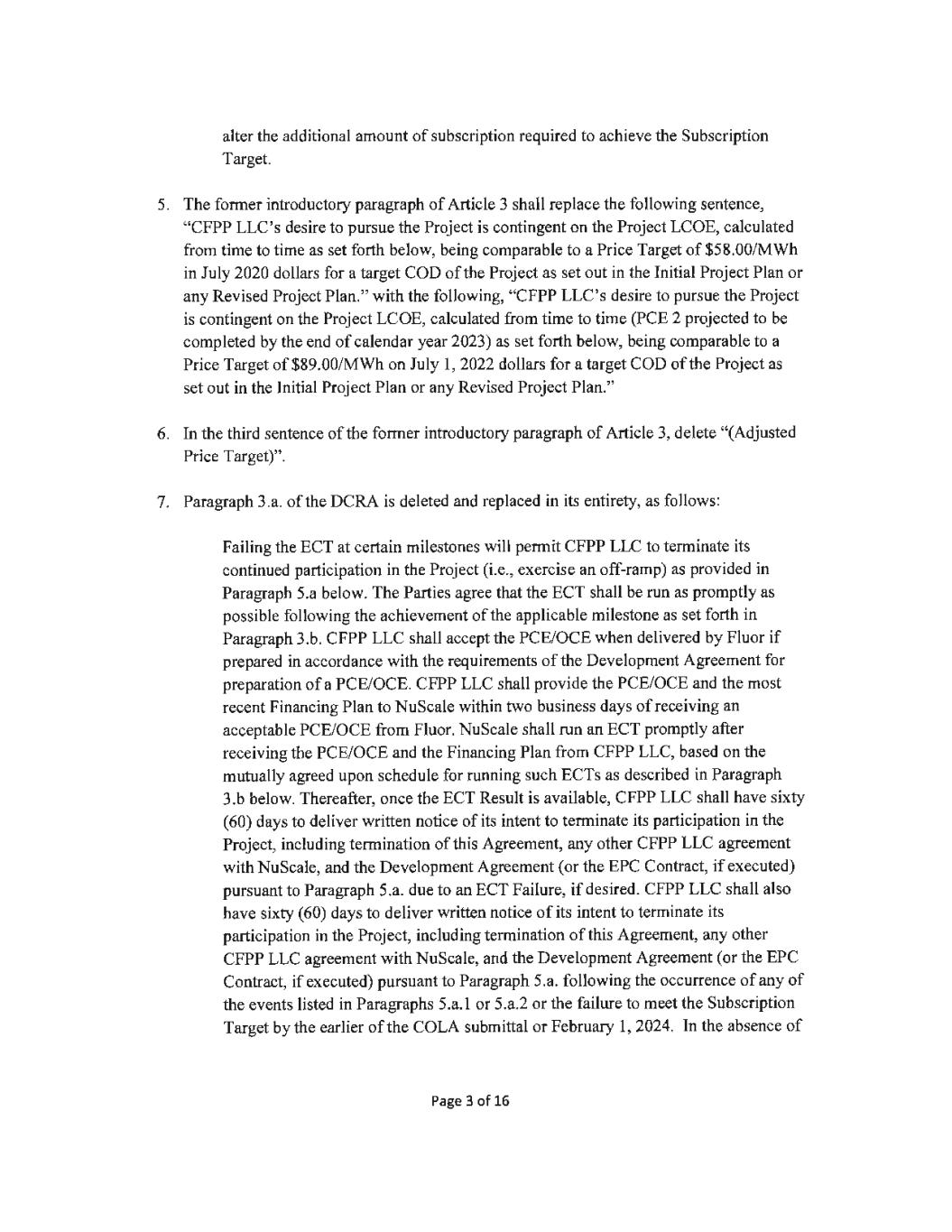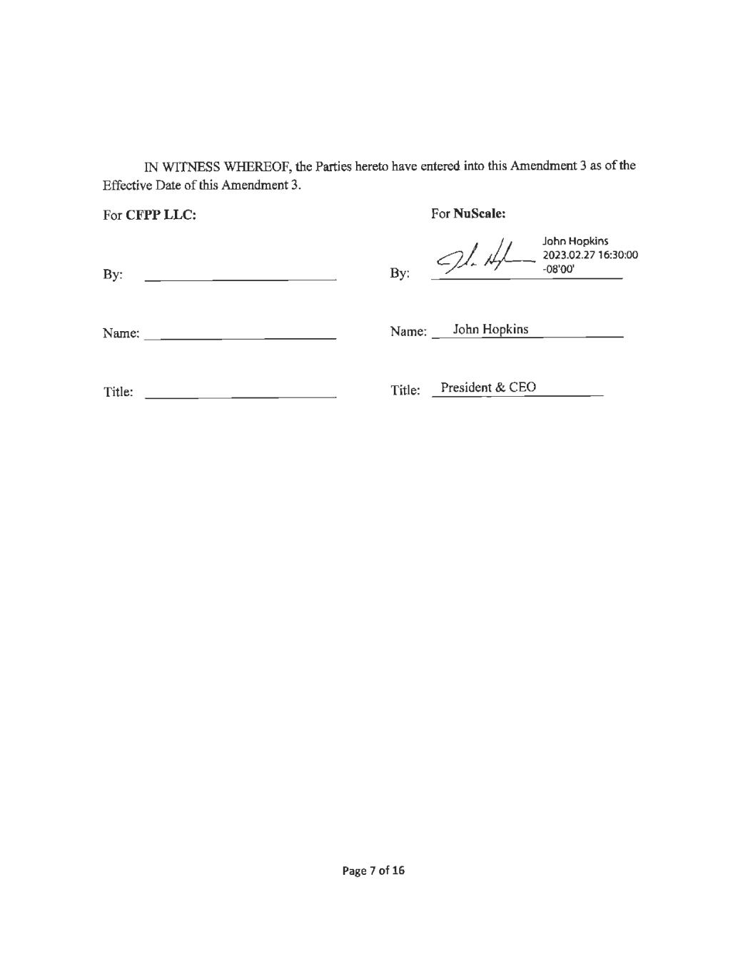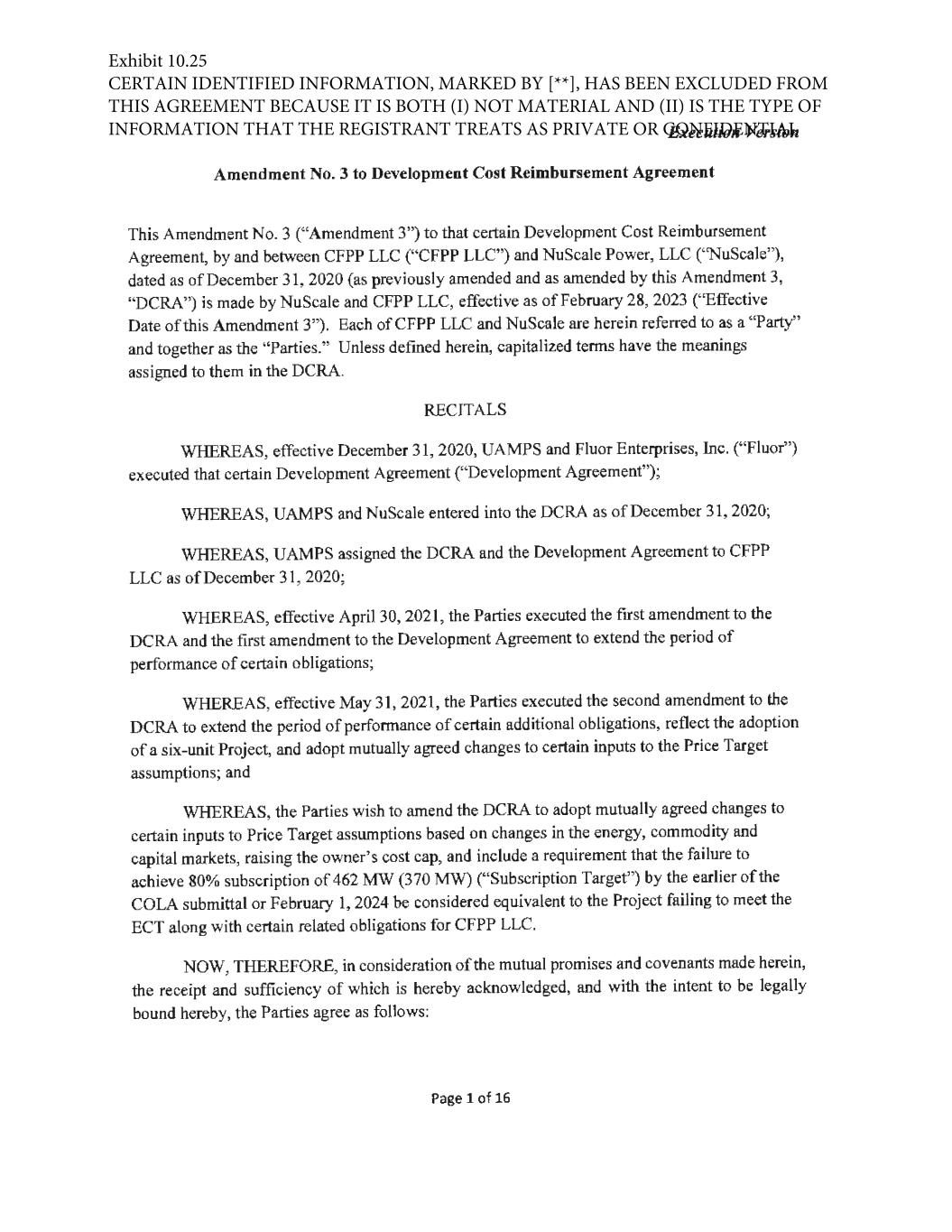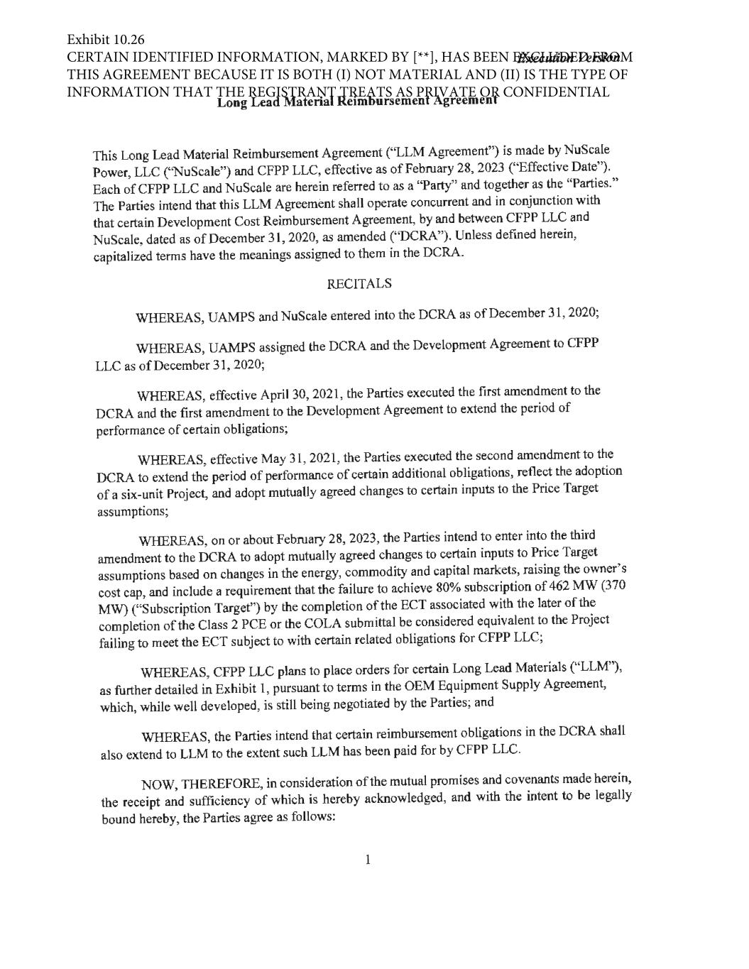 In December 2022, NuScale and Fluor provided CFPP LLC with the results of an economic competitiveness test (“ECT”) comparing the calculated LCOE for CFPP with the price target of $58.00/MWh as provided for under the amended DCRA. The LCOE exceeded the price target, meaning there was an ECT Failure. As a result of the ECT Failure UAMPS Members participating in the CFPP were given the opportunity to exit the Project. CFPP LLC had until March 1, 2023 to deliver notice that it intended to terminate its participation in the Project. If CFPP LLC had issued notice that it intended to terminate its participation in the Project by March 1, 2023, the Company could have been liable to pay CFPP LLC approximately $17.8 million and the Company would then have had the option to take over the Project assets and continue to develop CFPP. However, on March 1, 2023, UAMPS notified NuScale confirming that sufficient Project Participants have opted to continue with CFPP development notwithstanding the ECT failure. The next ECT is scheduled to be run in conjunction with the submission of the Class 2 PCE.