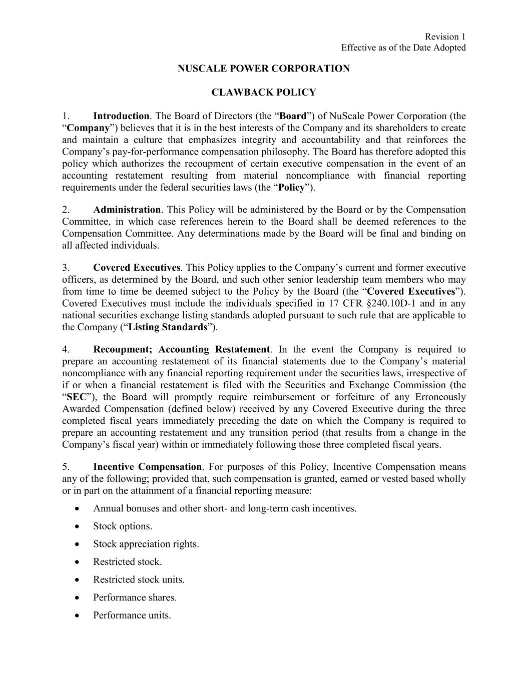 Options to purchase common units of NuScale LLC under the Fourth Amended and Restated 2011 Equity Incentive Plan of NuScale LLC (the “Legacy Plan”) were granted, before completion of the Transaction, at an exercise price equal to the fair value of the NuScale LLC units at the date of grant. In connection with the Transaction, all outstanding options to purchase NuScale LLC units converted into options to purchase 14,742,933 shares of NuScale Corp Class A common stock with no change to the remaining vesting schedule. Shares underlying those options, and an additional 17,760,961 shares of Class A common stock issuable under the Company’s 2022 long-term incentive plan (“2022 LTIP”), were registered on a registration statement on Form S-8, filed with the SEC on July 5, 2022. Except with respect to equity awards outstanding as of the completion of the Transaction, the Legacy Plan terminated on May 2, 2022, and no further equity awards will be made, or have been made since, under the Legacy Plan.